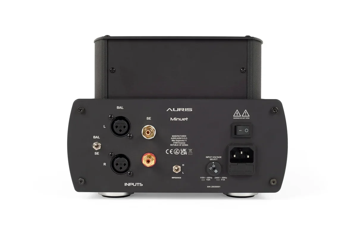 De Auris Minuet is een premium buizenhoofdtelefoonversterker met NOS EL95- of PL95-buizen van Ei Yugoslavia en een 12AU7 voorversterkerbuis, die een natuurlijke en warme geluidssignatuur levert. Het ultralineaire ontwerp zonder negatieve feedback zorgt voor een onberispelijke signaaloverdracht van bron naar hoofdtelefoon.